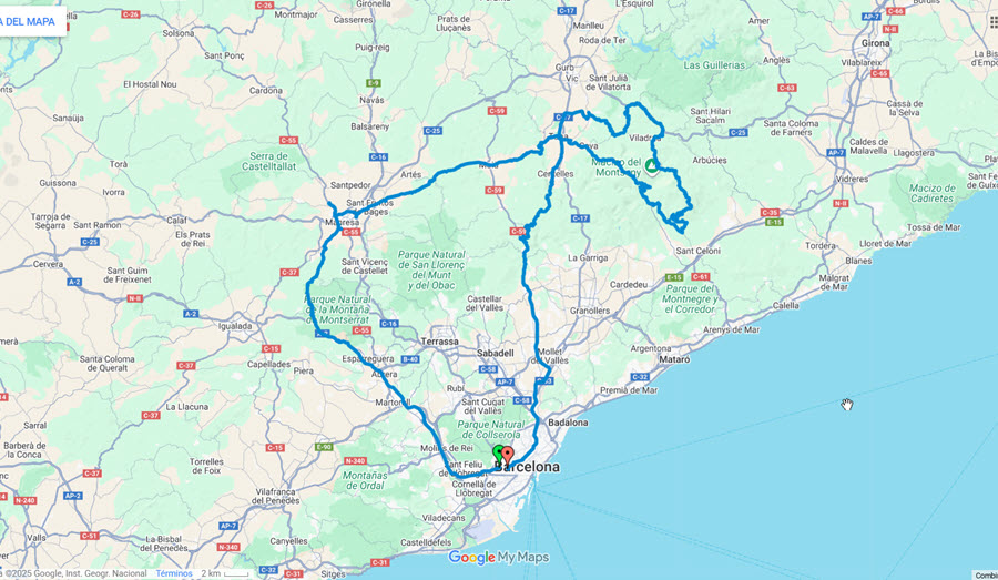 Ruta per les carreteres del Baix Llobregat, Bages, Moianès, Osona i Vallès Oriental. Esmorzar al Restaurant Bonaplata, a Sant Joan de Vilatorrada, Barcelona. Dinar al Restaurant La Ferreria, a Tona, Barcelona.
